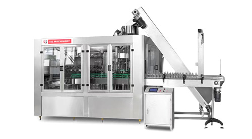 The bottle enters into the rinsing part of three-in-one machine through the bottle crew. The gripper installed on the rotary disk catches bottle and turns it over 180 degrees and makes the bottleneck face ground. In the special rinsing area, the nozzle on the gripper sprays water to rinse bottle inwall. After rinsing and draining, the bottle turns over 180 degrees along the guide rail and make the bottleneck faces sky. Then rinsed bottle is transferred to the filling part through poking bottle starwheel. Filling part adopts bottle-bottom bottle transmission way, the filling valve acted by the cam can realize up and down. It adopts pressure filling way. The filling valve opens and begins filling when it moves down and touches the bottleneck, the filling valve move up and leave the bottleneck when it finishes filling, the full bottle is transferred to the capping part through hold neck transition poking wheel. The stop screwing knife holds the bottleneck, keeps bottle upright not rotating. The screw capping head keeps in revolution and autorotation. It can finish a whole capping course including catching, pressing, screwing, discharging through the action of the cam.